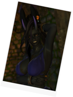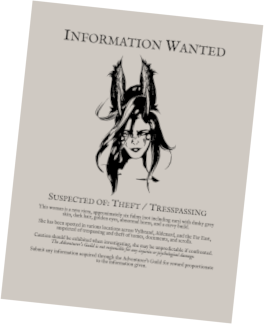 This woman is a rava viera, approximately six fulms (not including ears) with dusky grey skin, dark hair, golden eyes, abnormal horns, and a curvy build.She has been spotted in various locations across Vylbrand, Aldenard, and the Far East, suspected of trespassing and theft of tomes, documents, and scrolls.Caution should be exhibited when investigating, she may be unpredictable if confronted.